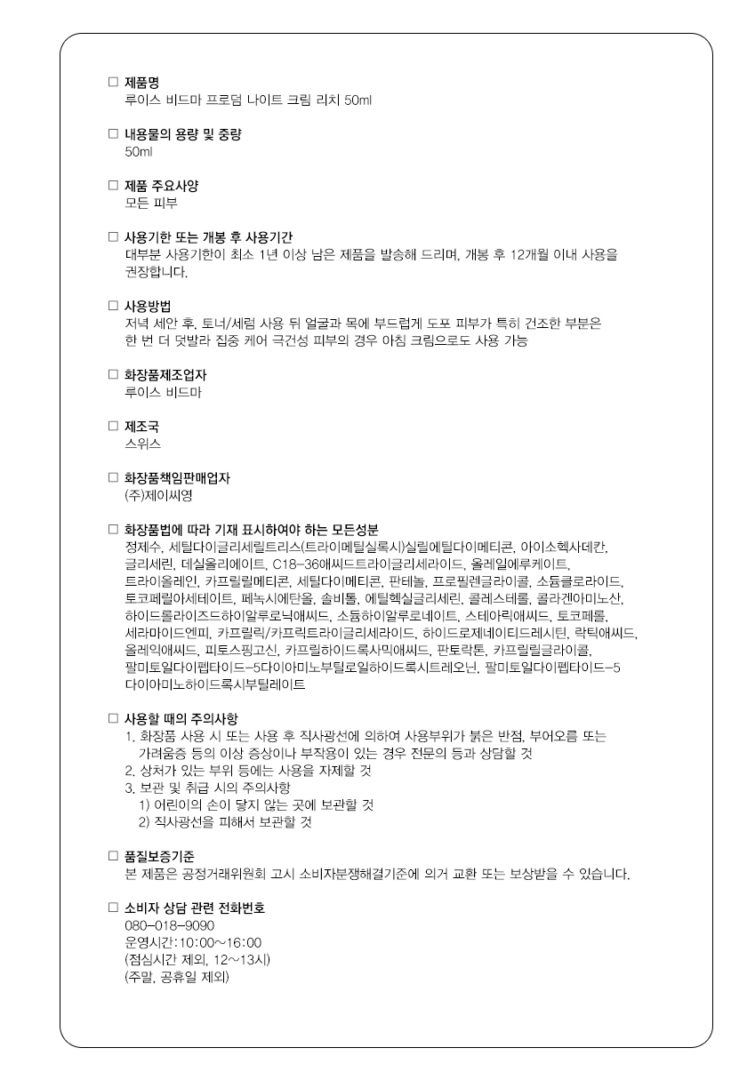 사용 방법 ㆍ 저녁 세안 후, 토너/세럼 사용 뒤 얼굴과 목에 부드럽게 도포 피부가 특히 건조한 부분은 한 번 더 덧발라 집중 케어 극건성 피부의 경우 아침 크림으로도 사용 가능 추천 대상 • 당김·건조함이 쉽게 느껴지는 건성, 극건성 피부 • 밤 동안 편안하게 피부를 보습하고 싶은 분 • 부드럽고 촉촉한 피부 느낌을 선호하는 분 • 매끄럽고 정돈된 피부결을 원하는 분 • 영양감 있는 크림을 찾는 분 "왜 루이스 비드마 프로덤 나이트 크림 리치 인가요?" 풍부한 보습감을 지닌 텍스처에 히알루론산·세라마이드·펩타이드 바이오스티뮬레이터 콤플렉스가 편안해 보이도록 케어합니다. 건조함이 쉽게 느껴지는 피부도 부담 없이 사용할 수 있으며,꾸준히 사용할수록 피부가 더 부드럽고 정돈된 느낌을 경험할 수 있습니다. 하루의 끝, 피부를 포근하게 감싸주는 나이트 케어의 기본템으로 추천드립니다.