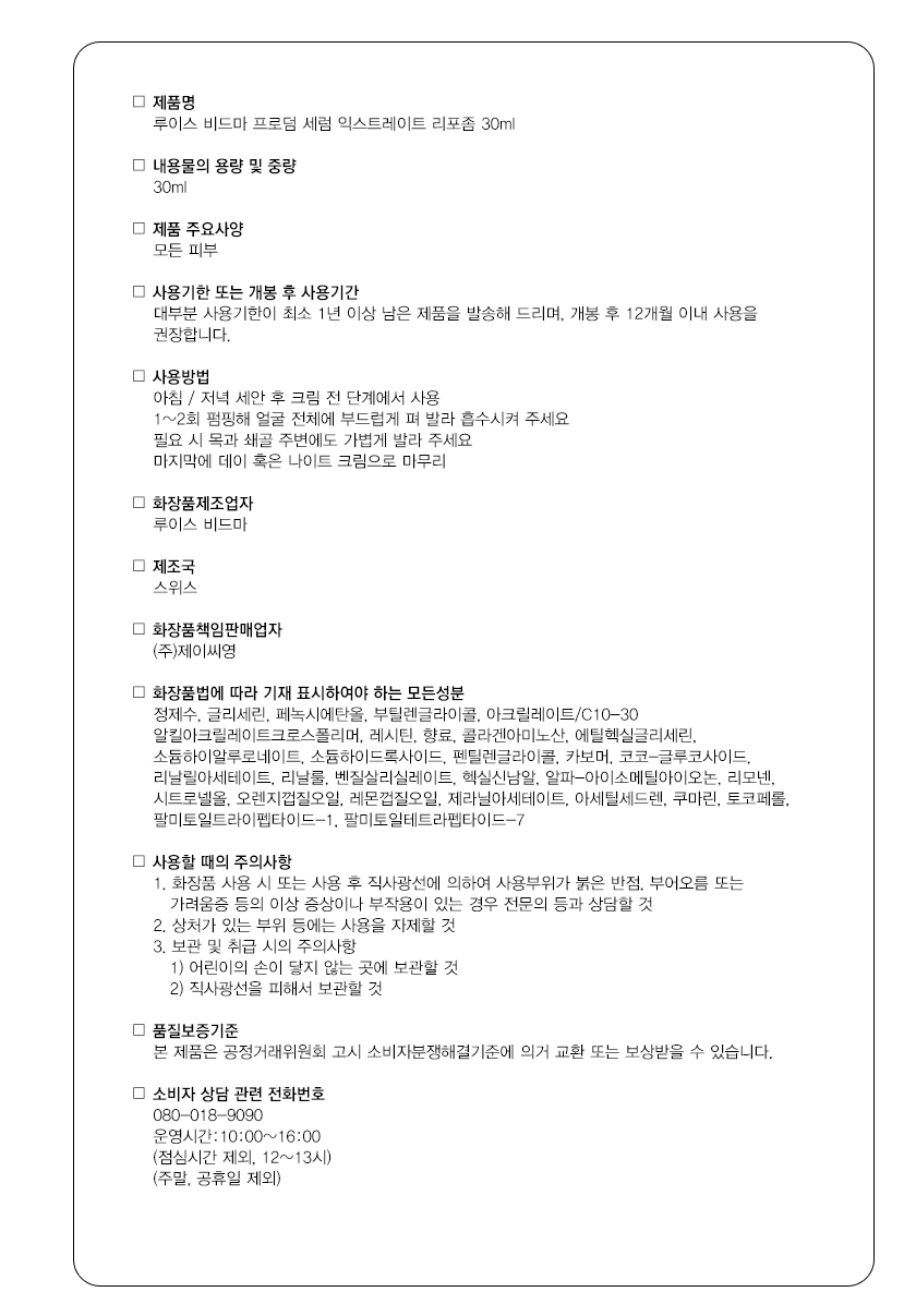 사용 방법 ㆍ 아침과 저녁 세안 후, 크림을 바르기 전 단계에서 사용하세요 1~2회 펌핑해 얼굴 전체에 부드럽게 펴 발라 흡수시켜 주세요 필요 시 목과 쇄골 주변에도 가볍게 발라 주세요 마지막에 데이 또는 나이트 크림으로 마무리해 주세요. 추천 대상 • 매일 사용할 수 있는 순한 수분 세럼이 필요한 분 • 건조함을 느끼는 모든 피부 타입 • 피부를 부드럽고 매끄럽게 케어하고 싶은 분 • 낮과 밤 모두 활용 가능한 데일리 제품을 찾는 분 "왜 루이스 비드마 익스트레이트 리포좀 인가요?" 고농축 히알루론산·아미노산·Matrixyl® 3000이 조화롭게 배합되어 피부에 촉촉함과 편안한 활력감을 더해 주는 데일리 세럼입니다. 스킨케어 루틴에 부담 없이 사용할 수 있어 매일 꾸준히 쓰기 좋은 제품입니다. 매일, 피부에 부드러운 에너지를 채워보세요.