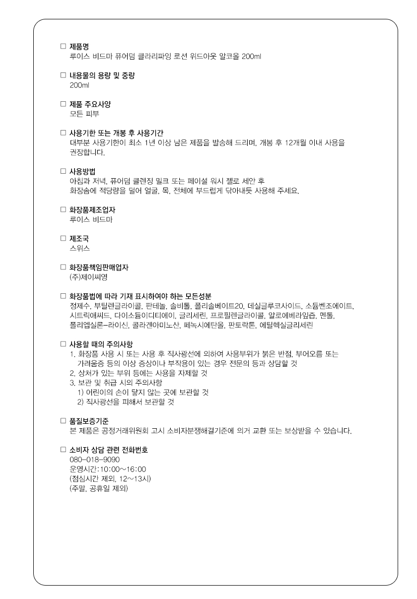 루이스 비드마 퓨어덤 클래리파잉 로션 무알코올 200ml Louis Widmer purederm Clarifying Lotion without Alcohol 피부를 건조하게 하지 않는 무알코올 성분이 세안 후 피부를 산뜻하게 정돈하고 다음 단계 스킨케어의 흡수를 돕는 데일리 클라리파잉 로션입니다. 모든 피부 타입이 부담 없이 사용할 수 있으며, 민감해진 피부에도 편안한 사용감을 제공합니다.